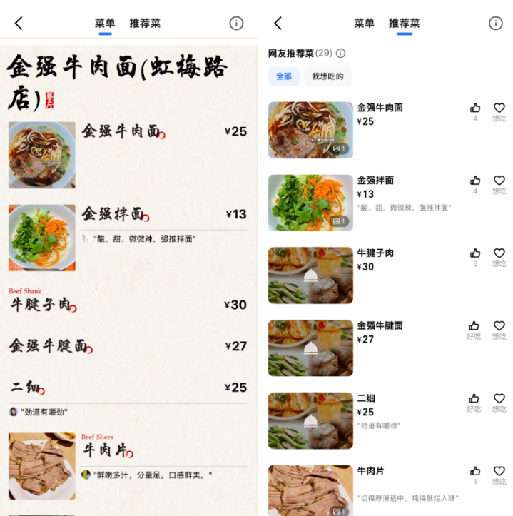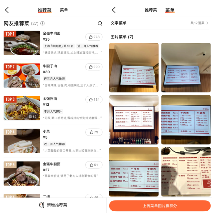 关于推荐菜和菜单,这块的设计确实需要夸一下高德,菜单使用了偏中国风的设计,让人觉得很有设计感,反观大众点评关于菜单,让用户直接拍张上传实体菜单,这确实又不直观又不美观。