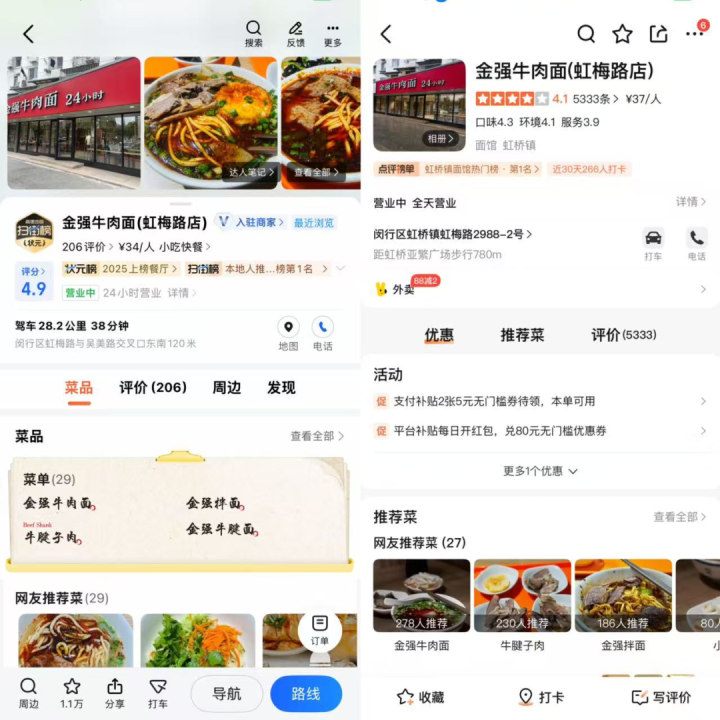 高德的主菜单是菜品、评价、周边、发现,下面的按钮是周边、收藏、分享、打车、导航、路线,大众点评的主菜单优惠、推荐菜、评价,下面的按钮是一键三连收藏、打卡、写评价。