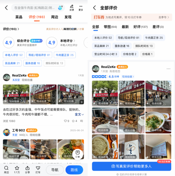 这里大众点评有一个优势在于它的评价可以服务于外卖,和外卖是打通的,而高德本质上是导航,在地图中点外卖这个场景不存在,而且想想都有点怪,所以之后高德应该也不会和淘宝闪购打通,只能上高德看完评分,去淘宝闪购点外卖。
