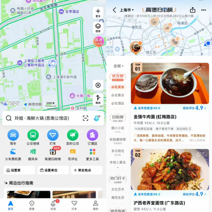 而且高德地图覆盖全国超700万个餐厅点位,每天有1.2亿次生活服务相关搜索,导航前往1300万个生活服务目的地,日导航总里程超15亿公里。这些庞大而真实的行为数据,是扫街榜得以成立的坚实基础。
