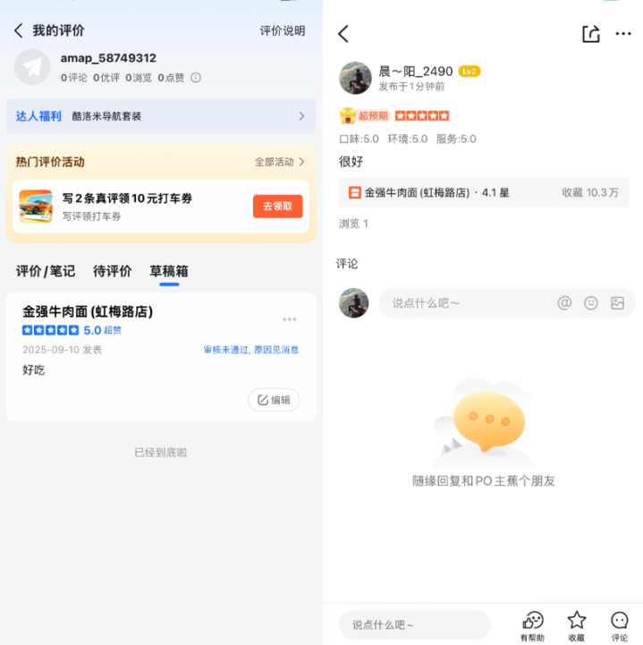 我测试了一下,确实如此的,大众点评只要评价基本都会审核通过,而且是秒通过,反观高德,我发表了一个评价,一开始正在审核中,过了几分钟,提示我审核未通过。