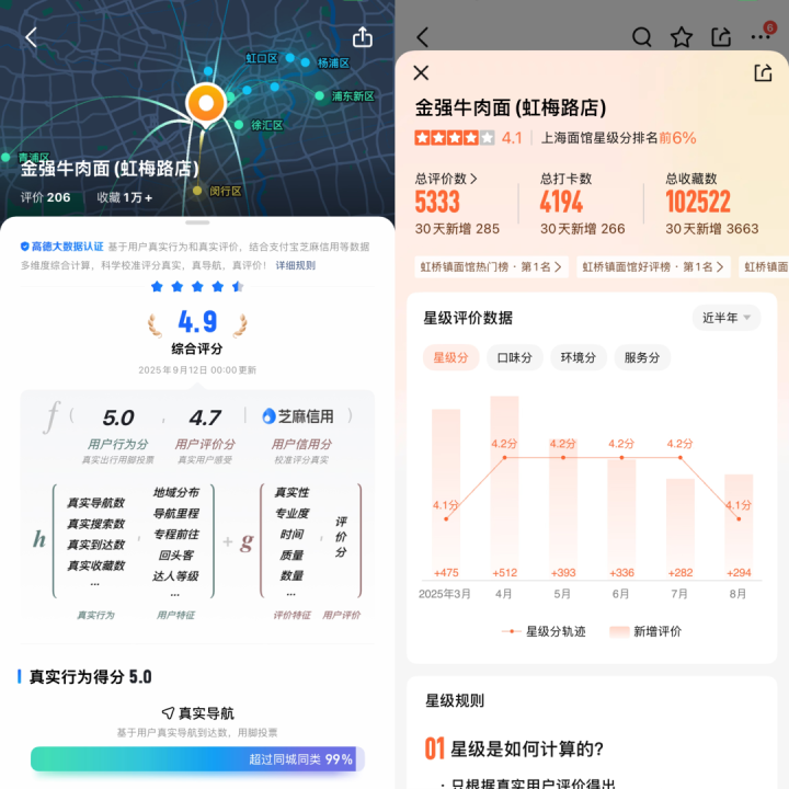 规则详情,大众点评分析的很细,也可以通过时间筛选看到不同时间段的评分变化,而高德,不能筛选时间,而且只显示类似超过同城同类99%这样虚化的数据,如果能显示真实的具体数据,就更让用户了解和信服了!!