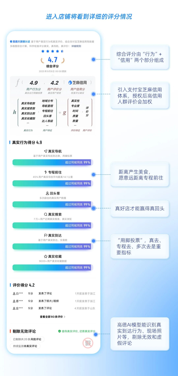 信用赋能,高德还首次引入了支付宝芝麻信用体系,结合用户信用等级为可信评价加权,并借助AI风控能力有效识别和过滤虚假信息、噪声评价。这种“言而有信”的机制进一步保障了榜单的可信度。